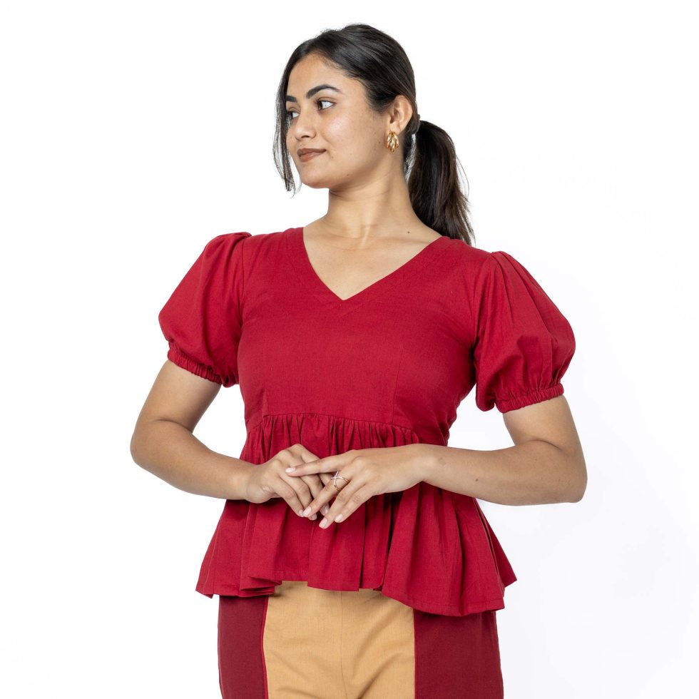 This red peplum top features a deep V-neckline paired with short puffed sleeves, detailed with gathered shoulders and softly cuffed hems. Designed with an empire waist, it flows into a gathered peplum flare that enhances a feminine silhouette. The bodice showcases subtle vertical ribbed texture, beautifully contrasted by a smooth, fluid hem for effortless elegance.