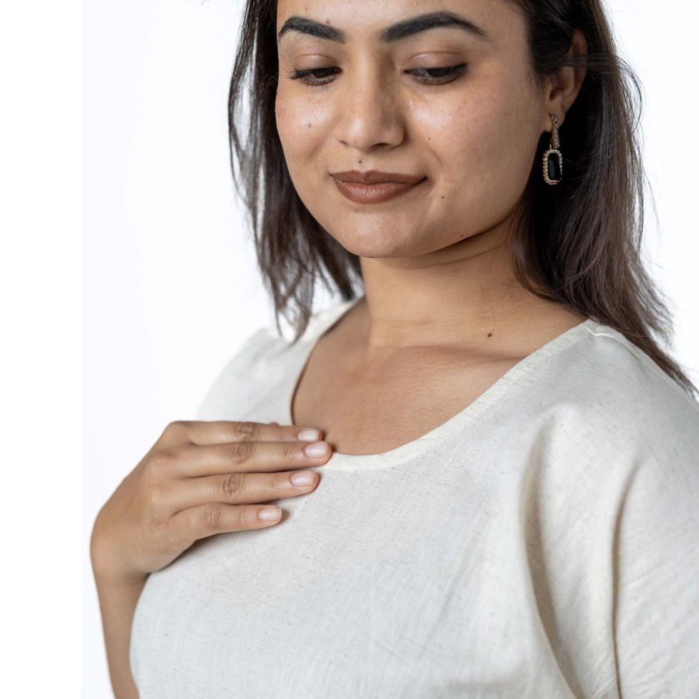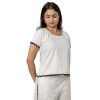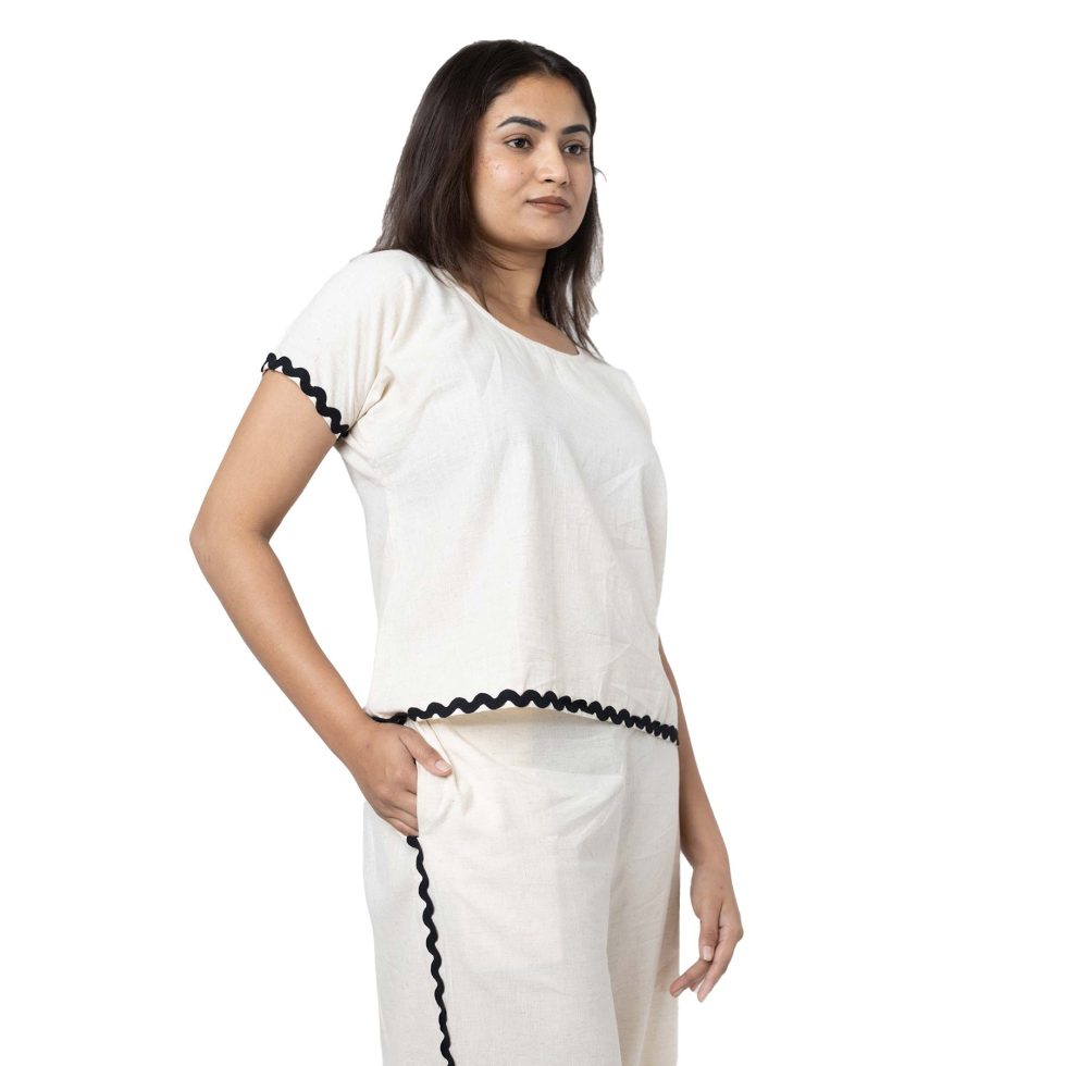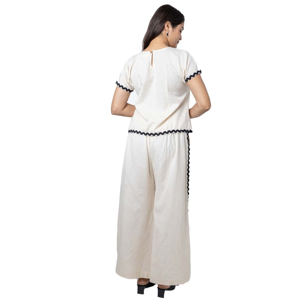 This off-white solid two-piece co-ord set features a cropped top and matching trousers for a cohesive, statement look. The top is designed with a round neckline, short extended sleeves, and a scalloped black lace trim along the neckline, sleeves, and hem. Paired with high-rise wide-leg trousers accented with contrast scalloped lace at the sides, the set blends comfort with refined detailing for effortless day-to-evening wear.