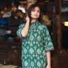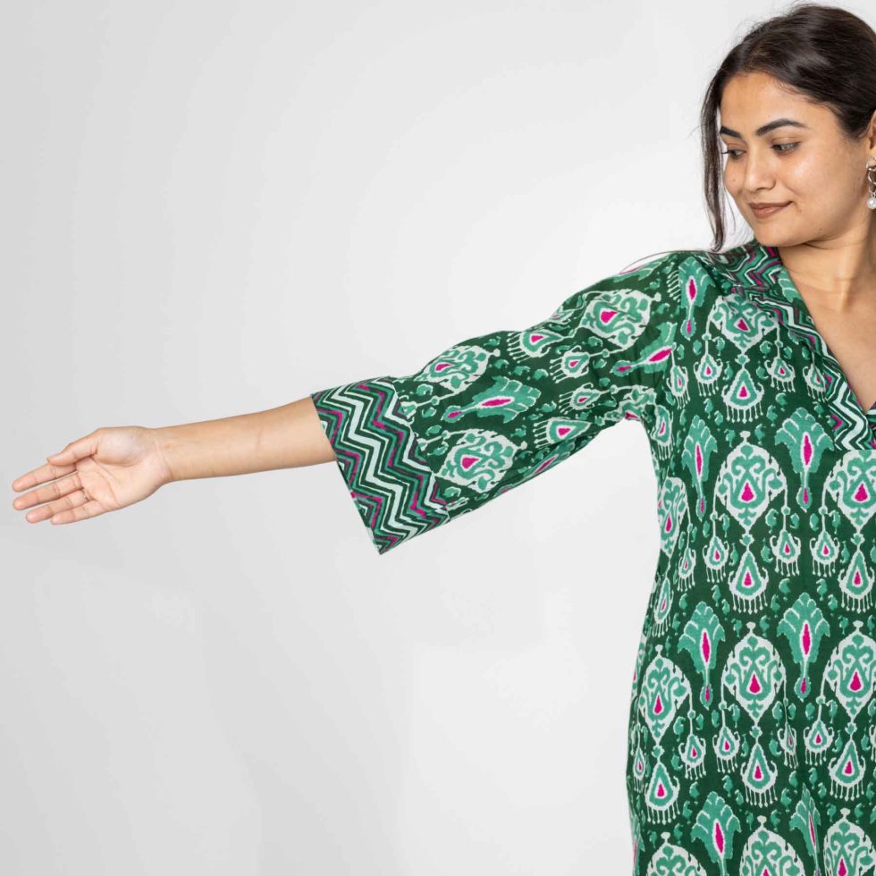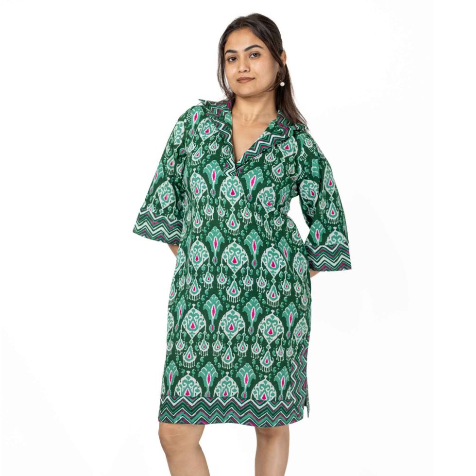 Green colourblocked A-line tunic dress with a shirt collar, deep V-neck, oversized kimono-style sleeves, and contrast panel detailing at the sleeves and hem. Made from 100% cotton, this mini-length dress features a straight hem, opaque woven fabric, and offers comfortable everyday wear.
