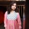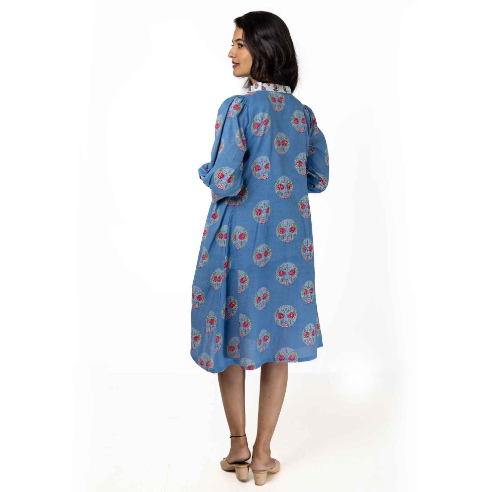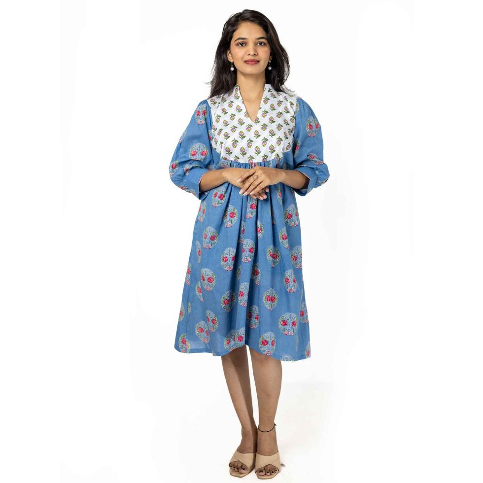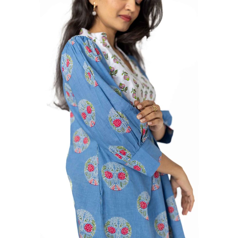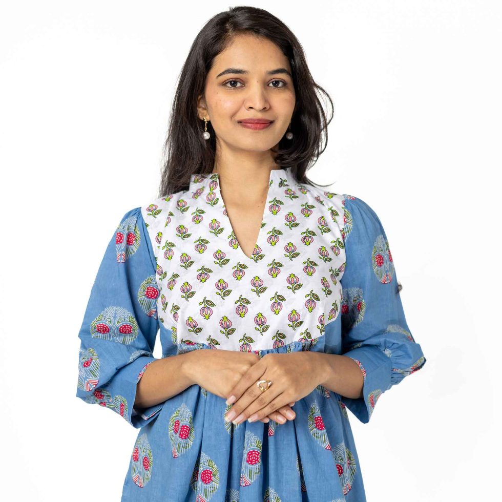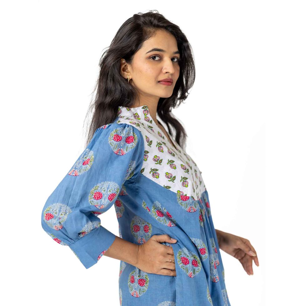Blue floral printed A-line mini dress featuring a mandarin collar with split V-neck and tie-up detail, long puffed sleeves, and a tiered ruffled hem. Crafted from 100% cotton, this opaque woven dress offers a comfortable fit with gathered detailing and an elegant everyday look.
